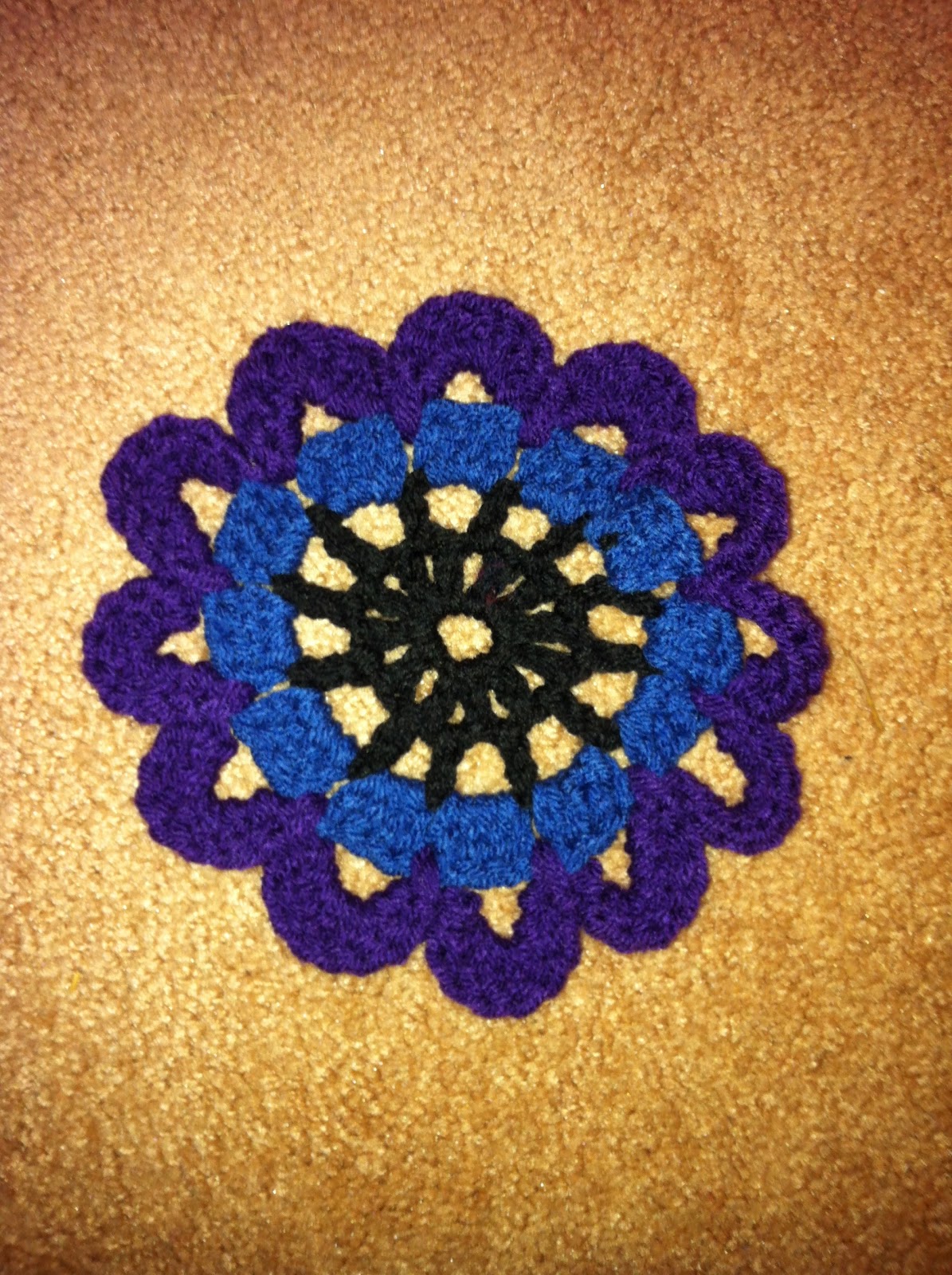As requested by a friend and customer, the Japanese Flower Bag #2 is a piecewise work of art! I enjoyed making this bag with all it's bumps and kinks and found the end result satisfying. Upon my friend liking the original Japanese Flower Bag, I began talking to her about different possibilities and she became excited about a customized bag for her. After she choose the three colors she wanted I drew up a variety of color schemes and had her choose which one she liked best. We looked at drawings twice for a satisfactory color pattern. Once I knew what I needed, I found the yarn and put my nose to the grind! The following pictures tell the story of how this bag was made starting with the drawing my friend selected.